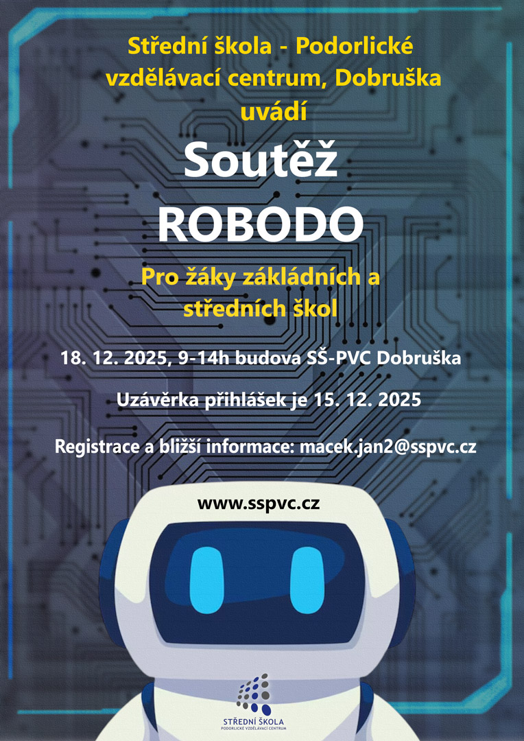 SŠ-PVC Dobruška jako již tradičně pořádá robotické klání ROBODO 2025. ROBODO je soutěž pro mladé začínající robotiky ze základních a středních škol, kteří mají zájem o nové technologie a robotiku, a jsou sdružováni např. v zájmových kroužcích. Soutěž proběhne dne 18. 12. 2025 od 9h v nové budově školy na adrese Pulická 695 v Dobrušce. Dveře jsou otevřeny i všem divákům, kteří se prozatím nerozhodli zúčastnit, ale přesto soutěžícím přijdou fandit a nechají se inspirovat pro další ročníky naší soutěže.